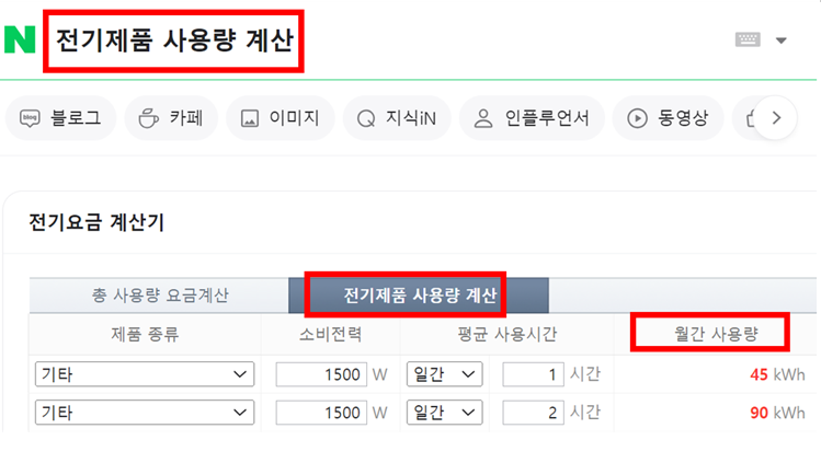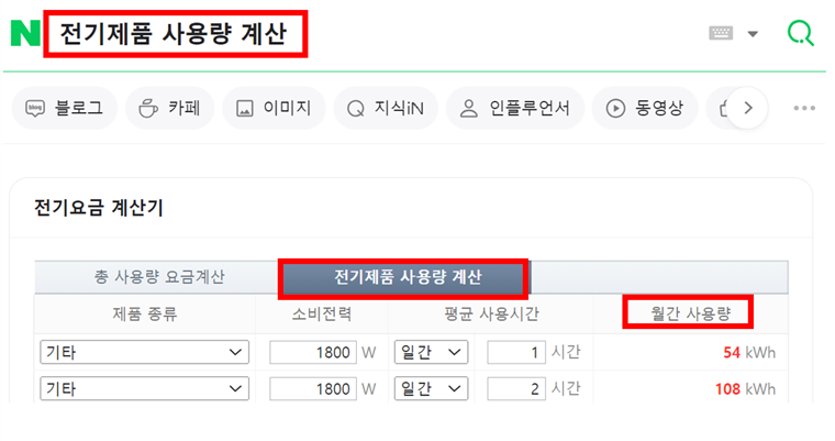 * 매일 1시간 2시간 사용시 월간 전기 사용량