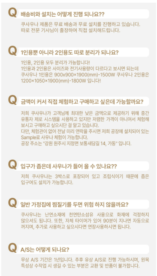 먼저 저희 쿠사우나를 구매하시기전에 많은 점이 궁금하실텐데요!