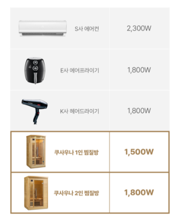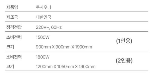 저희 쿠사우나 1인용은 1500W이고 2인용은 1800W입니다