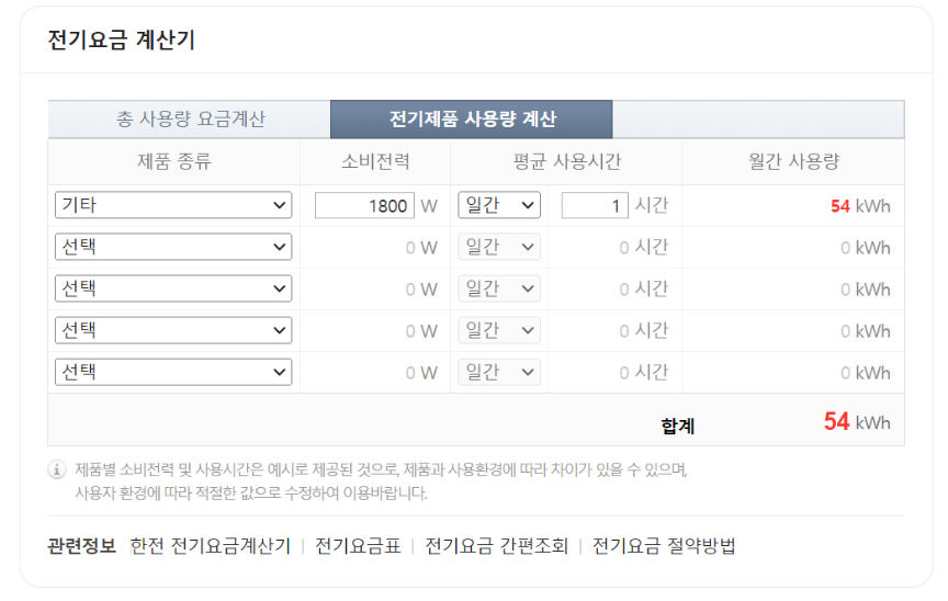 가장 전기용량이 높은 2인용 1800W로 계산하면