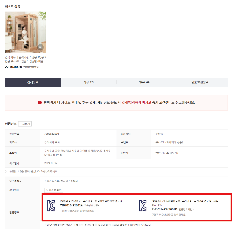 쿠사우나는 불연성 시험과 가스 유해성 시험 인증으로