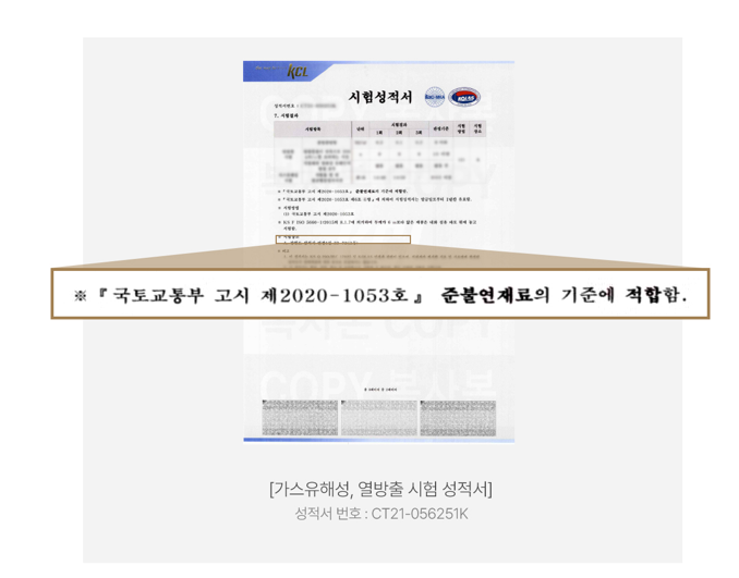 불연성 시험과 가스 유해성 시험 인증으로